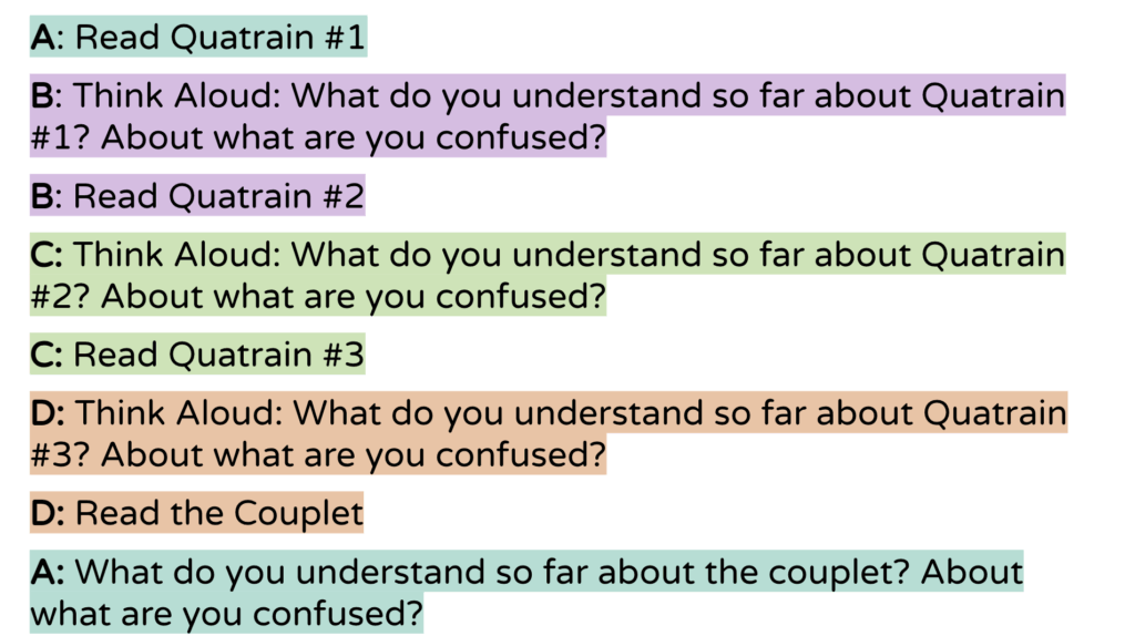 3. Shakespeare’s Sonnet 86 — After the pop sonnets, we read Shakespeare’s Sonnet 86. I have students work in groups of four and label themselves A, B, C, and D. Then, they do a think-aloud activity (see photo below). Finally, after the the think-aloud, we talk through the poem together under the document camera.