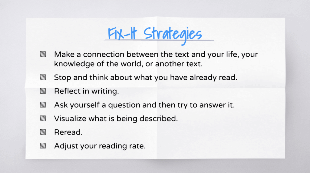 • Finally, I open it to a whole-class discussion. Groups/partners share a fix-it strategy that they applied and the extent to which it helped them make sense of the text.