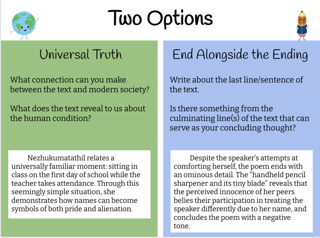 • After writing body paragraphs, students work collaboratively to put everything together. They begin with their thesis in the introductory paragraph, then their three body paragraphs, and finally they add a conclusion. I teach two options for conclusions: (1) ending alongside the ending or (2) stating a universal truth. See below for an example.
