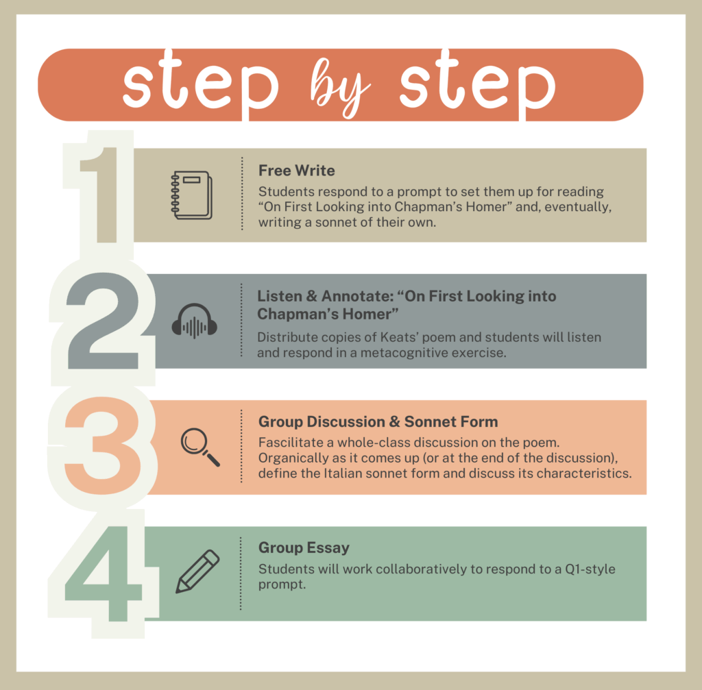2. Listen & Annotate: “On First Looking into Chapman’s Homer” — Distribute copies of Keats’ sonnet. For this poem, I lead students through a short metacognitive exercise to help them develop the skills they need to break down complex texts. Here are the steps: