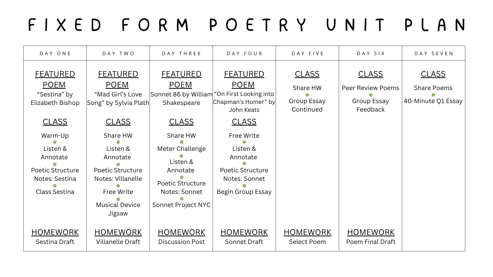 I’ve been writing day-to-day lesson plan posts for my form poetry unit, but I’m realizing that the big picture is missing. So, in this post, I’m including the unit structure, essential question, AP skills addressed, and assessments. I hope it’s helpful if you’re interested in borrowing any of these ideas!