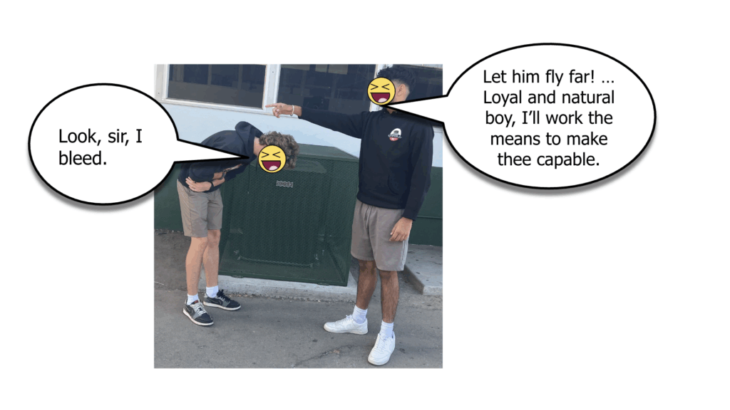 After they’ve had a chance to read the mini-scene, I explain the instructions for the tableau. Groups will work together to represent a significant moment from their excerpt in a photograph. Then, they will create a slide in which they include the photo and key lines from the excerpt. I like this activity because it gets students out of their desks and considering the movement of a scene without the fear that sometimes accompanies asking students to perform. Here are two examples: